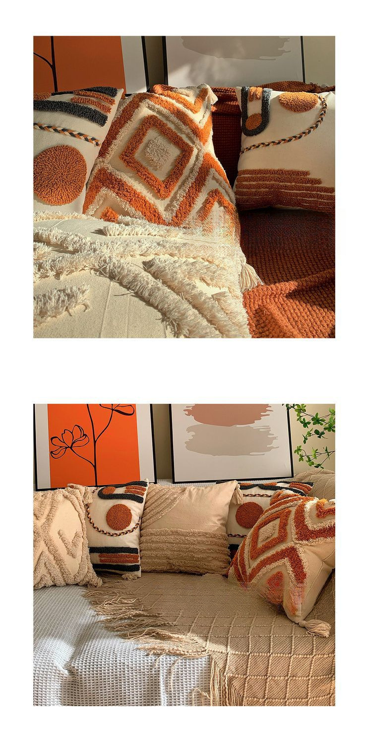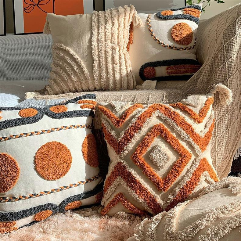 Color: Single thread, double thread, Bohemian orange, beige tufted lines, tufted green leaves, tufted beige leaves, tufted sun, loop-pile semicircle orange, CC lines, orange flat fabric, flannel plaid, fishbone